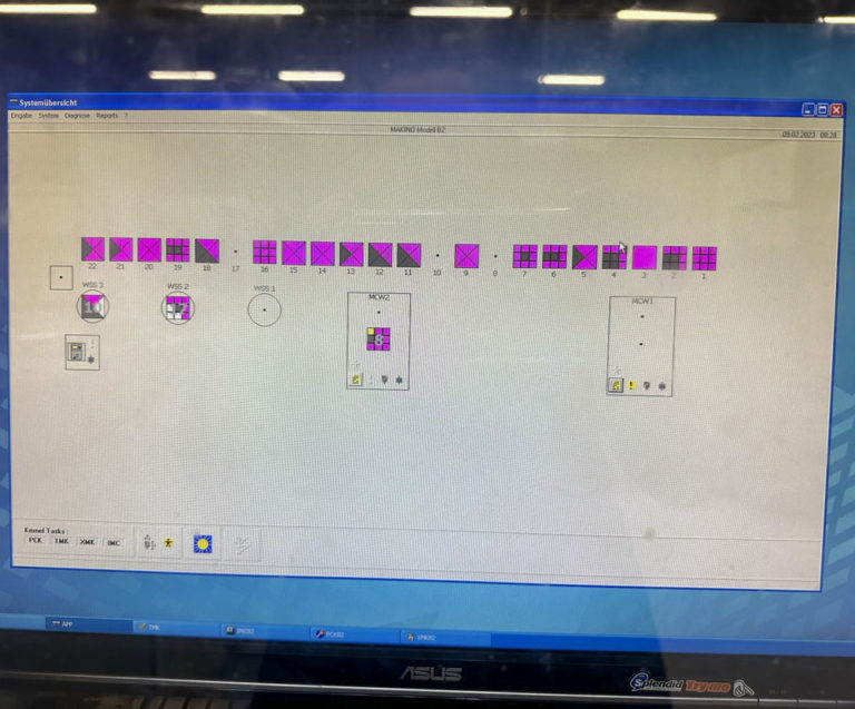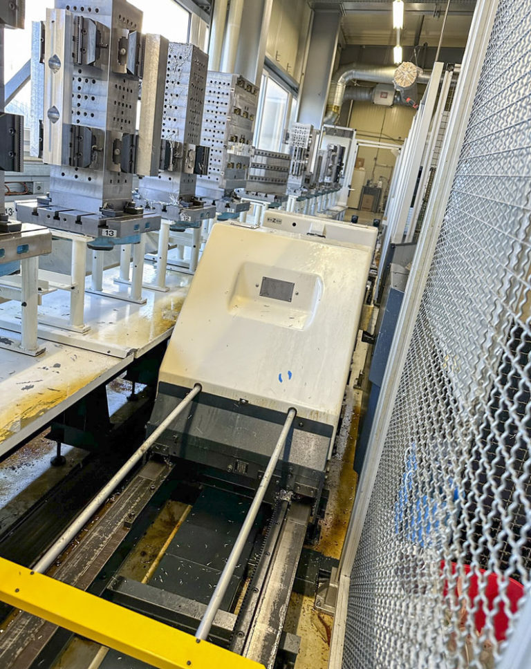 The system has three loading stations and two connections for machine tools (MAKINO A55 + A55e)